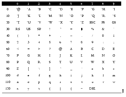 Many of the configuration commands described in this manual require the decimal representation of an ASCII character. Table E-1 provides translations from ASCII character to decimal number. To find the decimal equivalent of the ASCII character, add the row heading and column heading numbers together. To find the ASCII code for the percent (%) character, for example, add row 30 to column 7, so the ASCII code is 37.