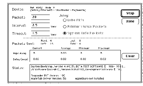 The response packet generated supplies the bootstrap firmware version string, followed by the router operating software version string. These are displayed in the position of the Macintosh System version and the Macintosh printer driver version, respectively, in such applications as Apple's Inter·PollTM.