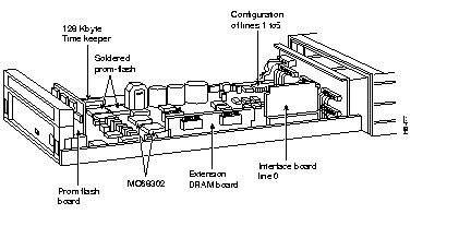 The FastPADmp6 processor board consists of a main card with two MC 68302 (L0) microprocessors, AC to DC conversion circuitry, and one slot for an interface card, jumpers, termination (Jxx), two slots for Flash SIMMs, and one slot for a DRAM SIMM.
