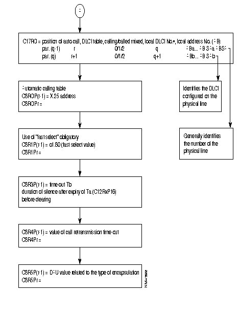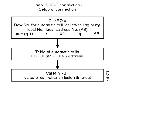 P3 P40 P41 P42 P45 | Logical Channel scanning direction Logical Channel organization T10, T20 restart timer T12, T22 reset timer T13, T23 clear timer Nbr of retry for P39,40,41 Diagnostic code suppression for P39,40,41 Signaling type Nbr of addresses in Call Request packet Subscriber number, significant if P44 = 1 Call Conf packet format | | 0 decreasing, 1 increasing