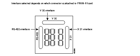 There are three connectors on the card that can be used to attach electrical interface adapters for each of the three data channels. The FRAM-01 interface adapter card converts the standard RS-232 interface for a selected data channel to V.35, V.11/X.21 or RS-449/422. The triplex cable provided with the card supports all three interfaces. There are three connectors on the interface adapter card that support each electrical interface: the electrical interface designations (V.35, RS422, and X.21) are silk-screened on the back of the card.