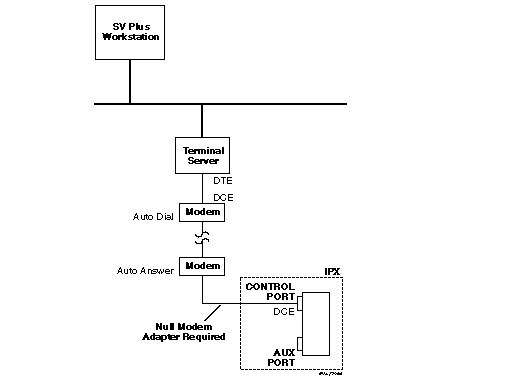 The connection of a StrataView Plus workstation to an IPX via a terminal server and modem is shown in Figure 2-5.