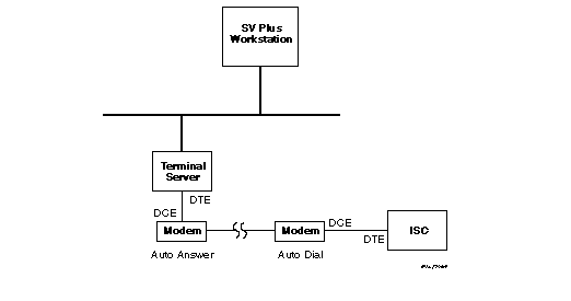The connection from StrataCom ISC to a StrataView Plus workstation via a terminal server and modem is shown in Figure 2-7.