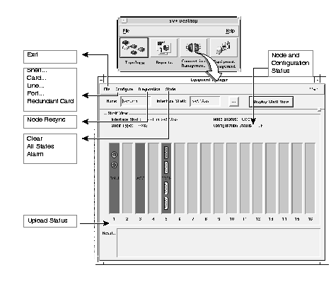 The StrataView Plus Equipment Manager can be presented from either the SV+ desktop icon, or from an AXIS node icon or a BPX node icon (which has AXIS nodes connected to its shelf) on the HP OpenView submap.To launch Equipment manager from HpOpenView submap, the StrataView Plus core processes must be running. The Equipment Manager contains tools for configuring AXIS-shelf cards, lines, and ports and may be viewed by multiple users at various SV+ workstations. However, a single SV+ desktop cannot run multiple sessions of the Equipment Manager.