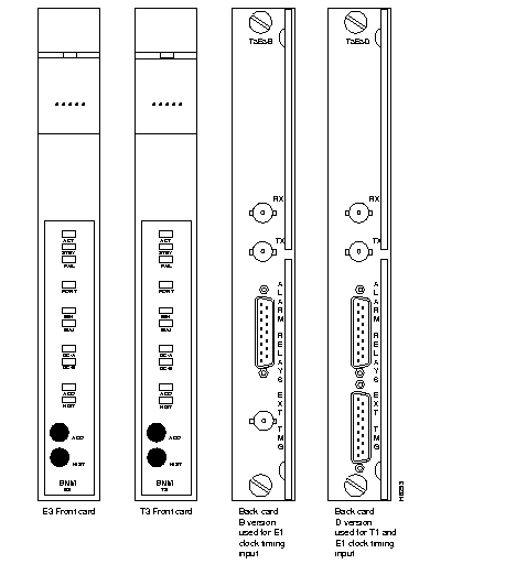 The Broadband Network Module (BNM) is a two-card set consisting of a BNM-T3 or E3 front card and a T3E3-D-BC or T3E3-B-BC back card. Either back card can be used with either front card except that the BNC clock connector only works for E1 clock sources. The shelf may contain a single BNM card set or a dual (redundant) card set. The cards are installed in slots 1 and/or 2.