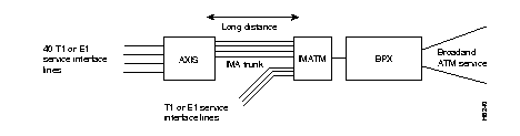 The IMATM accepts trunk signals from the BPX BNI over a single T3 or E3 connection and inverse multiplexes them over multiple T1 or E1 lines. The other end of the inversed multiplexed trunk is another IMATM card in a remote AXIS shelf (see Figure 4-2).