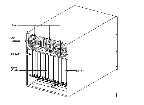 A fan assembly, with three six-inch 48 VDC fans is mounted on a tray at the rear of the BPX shelf (see Figure 2-2). Air for cooling the cards is drawn through an air intake grille located at the bottom in the front of the enclosure. Air passes up between the vertically-mounted cards and exhausts at the top, rear of the chassis. All unused slots in the front are filled with blank faceplates to properly channel airflow.
