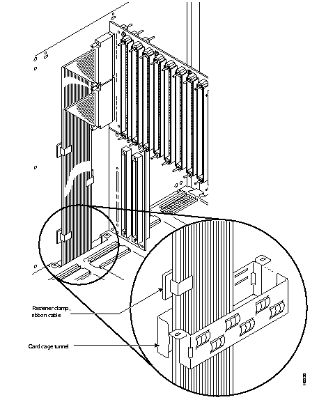 Step 10 Slip the ribbon cables through the fastener clamps, then attach the fastener clamps (which include a self-adhesive base) to the side of the card cage. See Figure 3-5.