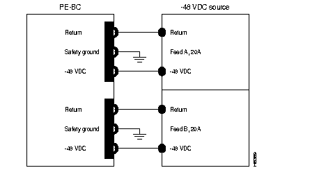 Wiring is connected from one or two -48 VDC power sources to one or two DC PEMs. StrataCom does not provide this wiring. Instead, the installer or customer must supply it. These wires should be capable of carrying 20 Amps. Figure 2-12 is a wiring diagram for a redundant DC power source.