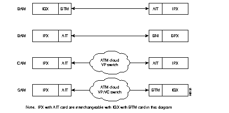 The IPX/IGX connect to a BPX or other ATM switch via an AIT/BTM T3 or E3 trunk.The AIT(IPX) or BTM (IGX) can operate in several different addressing modes selected by the user (see Table 7-4 and Figure 7-10). The BPX Addressing Mode (BAM) is used for all StrataCom ATM Networks. To allow the IPX or IGX to be used in mixed networks with other ATM switches, there are two other addressing modes available, Cloud Addressing Mode (CAM) and Simple Addressing Mode (SAM).