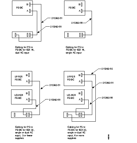 Table 2-2 shows the required number of power supplies for IGX 16/32 systems. In Table 2-2, the locations for primary (or minimal) power supplies are marked with an X. The primary supplies reflect redundancy of AC inputs and backup supplies. An O indicates a slot that must have a supply because the card cage contains more than 12 boards.