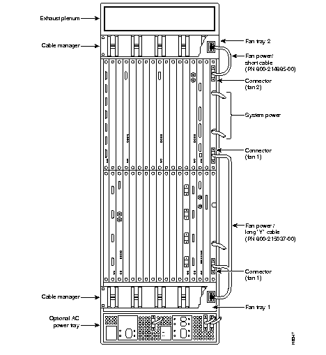 In an IGX 8 or 16, power to the fan tray comes from the "Fan 1" connector on the PE-BC (see Figure 2-12). In an IGX 32, the booster fan at the top receives power at the Fan 2 connector. The lower tray uses the two Fan 1 connectors. The Cisco StrataCom IGX Installation publication describes fan installation.