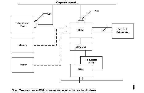 The SCM has duplicates of the internal clock circuitry and its associated phase lock loops and NPM-related control circuitry. One clock circuit operates off the System A Bus, and the other operates off the System B Bus. Both circuits operate independently and are monitored separately to provide complete backup if a circuit fails (which would cause the FAIL LED to turn on). However, because both the System A bus and System B bus clock circuits exist on a single card, removing the SCM disrupts system operation. The lower priority SCM circuits are not duplicated. The lower priority circuits are the external clock input, control and auxiliary ports, and monitoring circuits for power supplies, cabinet temperature, and fans. A failure in a lower priority circuit does not cause a system failure, but the SCM reports the problem.