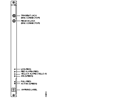 The AIT -T3 back card has two BNC connectors and six LED indicators, as Figure 3-9 shows. Table 3-12 lists these faceplate items. When you correlate the items in the figure and table, read from the top.