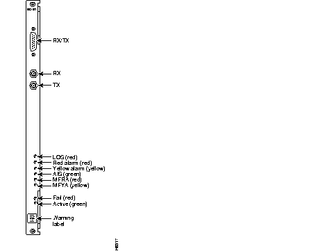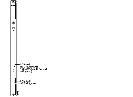 The faceplate of the ALM/B has four LEDs. See Figure 3-13 .The ACTIVE LED indicates the card is active and functioning. An ALM/B card failure triggers the FAIL LED. The other two LEDs are a summary alarm for the back card conditions. A yellow MINOR LED indicates either a fault that does not interrupt service or that error statistics have exceeded a preset threshold. A red MAJOR LED indicates a service-affecting failure.