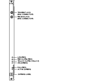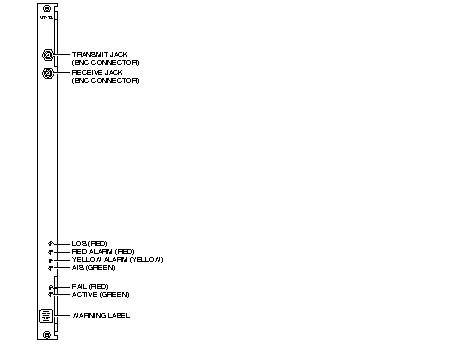 The ALM/A T3 and E3 back cards are the BC-UAI-1T3 and BC-UAI-1E3, respectively. Each back card has two BNC connectors and six LED indicators. For the BC-UAI-1T3 faceplate items, refer to Figure 4-3 and Table 4-5 . For the BC-UAI-1E3 faceplate items, refer to Figure 4-4 and Table 4-6. As you read from the top-down, the items in the figure and table correlate to each other. For technical specifications on T3 and E3 lines, refer to the appendix titled "System Specifications."