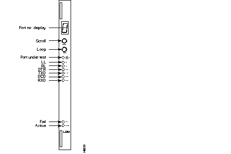 The faceplate of the LDM has message lights and buttons for loopback control and signal monitoring. Figure 4-37 shows and Table 4-36 lists these indicators and buttons. When correlating the figure to the table, read from the top down. The buttons are for loopback testing and scrolling through the FastPacket data ports to obtain a snapshot of selected port conditions (indicated by PORT, PORT UNDER TEST, loopback, and communication line status lights).