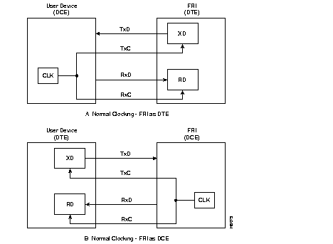Three clocking modes are available on the SDI for clocking in transmit data and clocking out receive data. In addition, the SDI can operate as either a DCE or DTE, which makes possible six combinations of clocking. (See Figure 4-35 and Figure 4-36 .) With loop clocking, the user device must loop the RxC to the XTC for clocking out the transmit data.