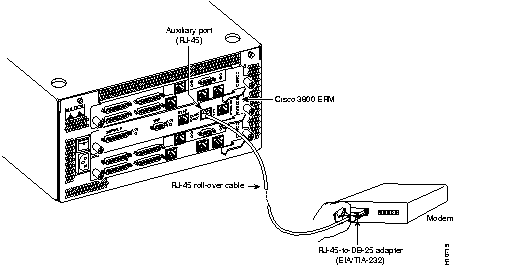 Step 1 Connect a modem to the auxiliary port using the thin, flat, RJ-45-to-RJ-45 rollover cable (it looks like a telephone cable) with the RJ-45-to-DB-25 adapter (labeled "Modem") included with the ERM. (See Figure 3-7.)