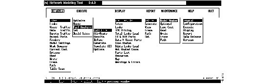The menus in the NMT design window contain selections for inputting data that describes the existing or proposed network. These menus also provide selections for generating optimized configurations and many different types of reports. (See Figure 2-1.) The menus are as follows: