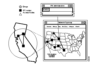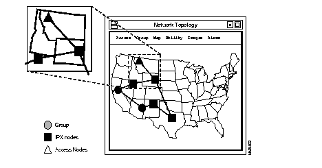 To select objects on the Network Topology map, position the cursor on the object and click the left mouse button. If you click on an IPX, BPX, or access node, you connect to that node and an Administration Window is displayed.