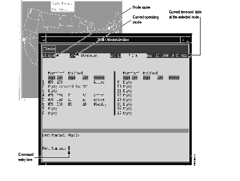 Use this menu to present the Node Administration window. This window provides a virtual terminal session to enable command line interface activities to a selected node. You can also use this window to interface with selected access devices, such as a FastPAD feeder MUX and an AIP, that are attached to network nodes The commands acceptable in this window are documented in the Command Reference Manual.