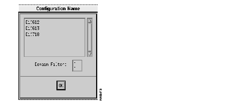 Click on one of the names in the Configuration Name dialog box to present the screen which lists the associated node's date and time of configuration save, the BRAM ID (BPX/IPX software version), and the node name.