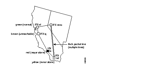 When the topology display is updated, the node and trunk icons change colors to reflect the latest alarm events.