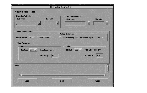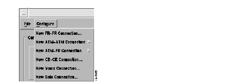 The pulldown menu in Figure 7-2 shows the connections you can configure from the Connection Manager Main window. The Voice and Data connections are different from Frame Relay and ATM connections in that certain parameters for voice/data are associated with channel rather than connection.