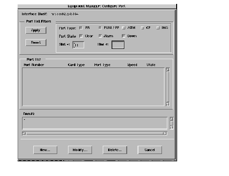The Port List dialog window is invoked by first selecting a card in the Shelf View region and then selecting Configure->Port from the menu bar of the Equipment Manager window. There are three window types for port configuration, depending on the card type.