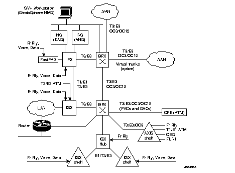 The StrataCom Product Family includes: the BPX Service Node which can include the Extended Services Processor (ESP) for SVC switching of ATM and frame relay connections, the IPX, and IGX switches, AXIS shelves, and IPX nodes configured as Interface Shelves, StrataSphere network management products, and Access Products including the AXIS and FastPAD.