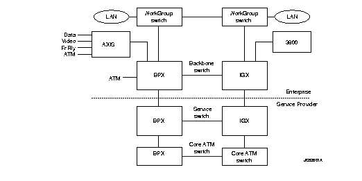 Similarly, the IPX or IGX nodes may be configured as shelves and connected to a BPX routing hub to provide a low-cost service input for Frame Relay to ATM interworking for the BPX. The IPX and IGX shelves concentrate this traffic over an ATM trunk connected to the BPX.
