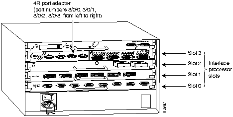 For example, the addresses for the 4R interface ports on the first port adapter on a VIP2 (see Figure 14) are 3/0/0 through 3/0/3 (chassis slot 3, port adapter slot 0, and interface ports 0 through 3). If the 4R port adapter was installed in port adapter slot 1, the interface addresses would be 3/1/0 through 3/1/3.