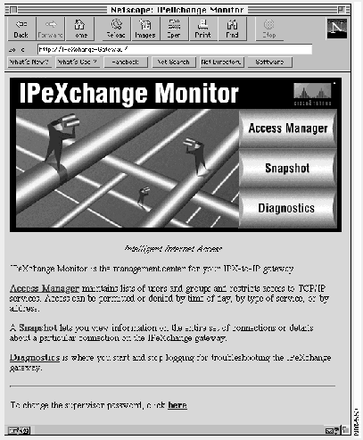 The Cisco IPeXchange Monitor can be accessed from any computer, including a PC, Macintosh, or UNIX workstation, that supports an HTML version 2 web browser, such as NetScape 2.0 or higher. This computer can be located anywhere on a network, as long as you can access the Cisco IPeXchange Internet Gateway through an IP connection.