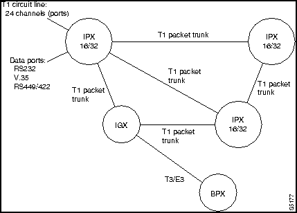 A simplified example of an IPX E1 network is shown in Figure 5-10. Each IPX node is connected to the user's PBXs and channel banks via E1 circuit-switched lines. Data connections are made via various data port interface types. The following network interfaces are supported by the IPX and IGX E1: