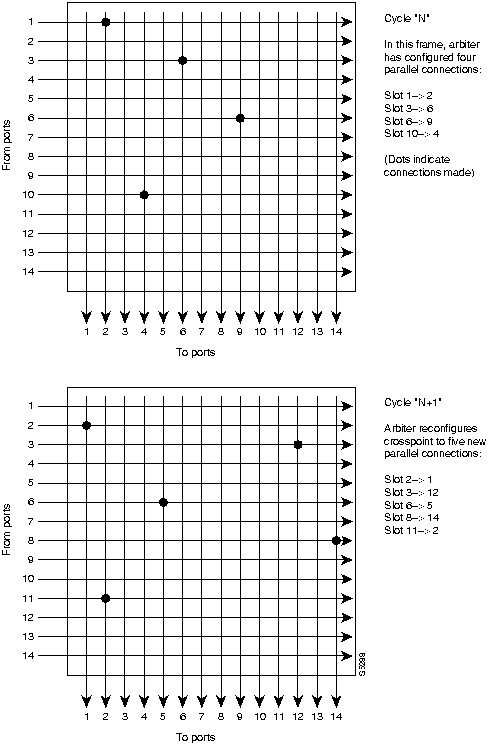 The StrataCom BPX is a 16 X 16 crosspoint switch implemented with a very high speed VLSI switching device. Its crosspoint switch is under control of an arbiter that takes requests from each port with traffic waiting to be switched and sets up the appropriate crosspoint. Multiple crosspoints are operated simultaneously at each switch cycle to connect various input and output ports as long as there is no contention for a particular crosspoint. Figure 7-12 illustrates several typical cycles of crosspoint matrix used in the BPX.