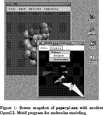 Section 2 describes how to use OpenGL rendering with either a standard Motif drawing area widget or an OpenGL-specific drawing area widget. Section 3 discusses using X Toolkit mechanisms for seamless animation. Section 4 provides advice on how to debug OpenGL programs by catching OpenGL errors. Throughout the discussion, a Motif-based OpenGL program named paperplane is used as an example. The complete source code for paperplane is found in the appendix. The program animates the 3D flight paths of virtual paper airplanes. The user can interact with the program via Motif controls. The program can be compiled to use either a standard Motif drawing area widget or an OpenGL-specific drawing area widget. Figure 1 shows paperplane running.