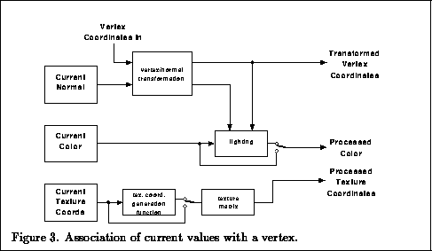 Each vertex may be specified with two, three, or four coordinates (four coordinates indicate a homogeneous three-dimensional location). In addition, a current normal, current texture coordinates, and current color may be used in processing each vertex. OpenGL uses normals in lighting calculations; the current normal is a three-dimensional vector that may be set by sending three coordinates that specify it. Color may consist of either red, green, blue, and alpha values (when OpenGL has been initialized to RGBA mode) or a single color index value (when initialization specified color index mode). One, two, three, or four texture coordinates determine how a texture image maps onto a primitive.