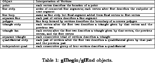 glBegin(GL_POLYGON); glVertex3i(0,0,0); glVertex3i(0,1,0); glVertex3i(1,0,1); glEnd();The ten geometric objects that are drawn this way are summarized in Table 4.1. This particular group of objects was selected because each object's geometry is specified by a simple list of vertices, because each admits an efficient rendering algorithm, and because it was determined that taken together these objects satisfy the needs of nearly all graphics applications.