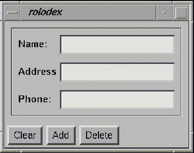 A mock-up of the user interface can be a useful place to start the design of an interactive application, because it is common for some parts of a program to correspond to logical groupings of elements of the user interface. For example, Figure 7 shows a proposed user interface for an overly-simplified address book program named rolodex.