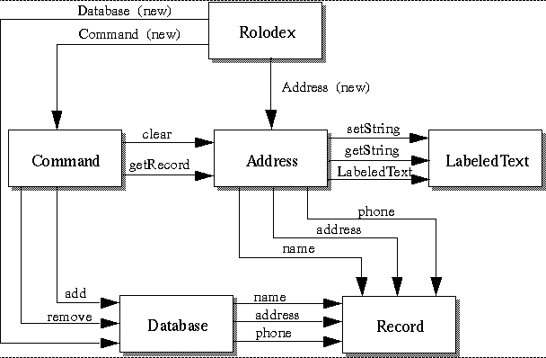 The Rolodex class can be decomposed further. The screen shows a logical address area, and a command panel along the bottom. These can be implemented as Address and Command classes. The Address object consists of individual labeled text areas, which could each be implemented as a still smaller component, a LabeledText class.