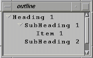 /////////////////////////////////////////////////////// // outline: exercise the ViewKit outline component ////////////////////////////////////////////////////// #include#include #include class MyWindow : public VkWindow { public: MyWindow(const char *name); }; MyWindow::MyWindow(const char *name) : VkWindow(name) { // Create a VkOutliner component and add it as a view VkOutline *outliner = new VkOutline("outliner", (*this)); addView(outliner); // Construct a hierarchy by adding parent/child pairs outliner->add("Heading 1", "SubHeading 1"); outliner->add("Heading 1", "SubHeading 2"); outliner->add("Heading 1", "SubHeading 3"); outliner->add("SubHeading 1", "Item 1"); outliner->displayAll(); // Show the entire outline } void main ( int argc, char **argv ) { VkMsgApp *app = new VkMsgApp("Outline", &argc, argv); MyWindow *win = new MyWindow("outline"); win->show(); // Display the window app->run(); // Run the application }